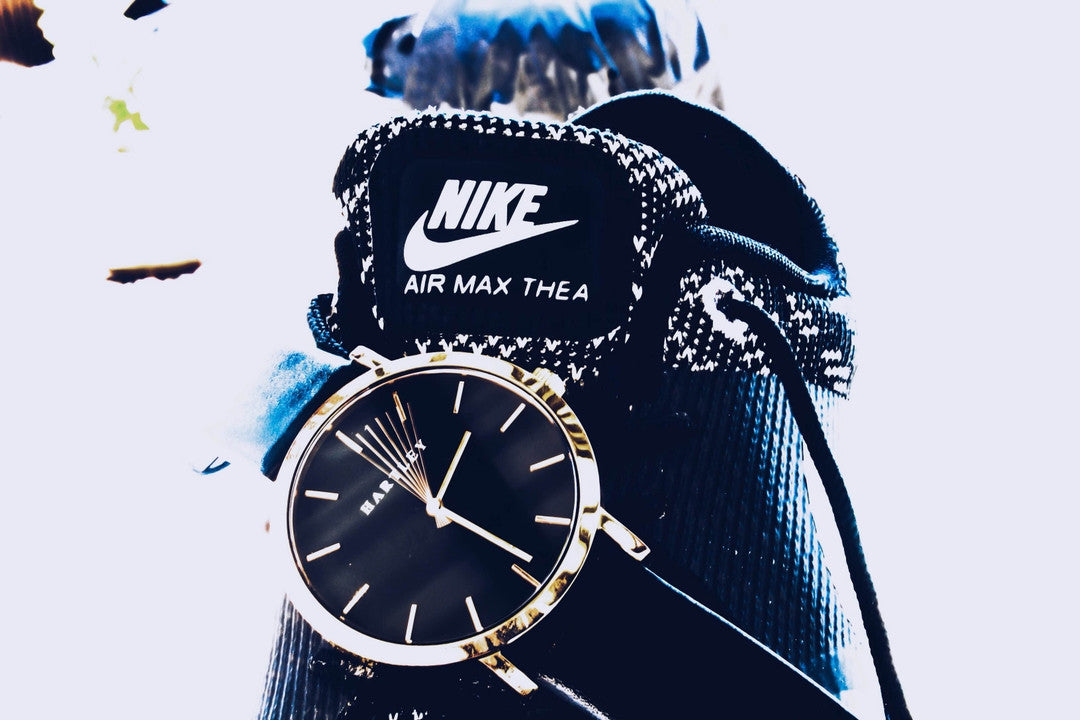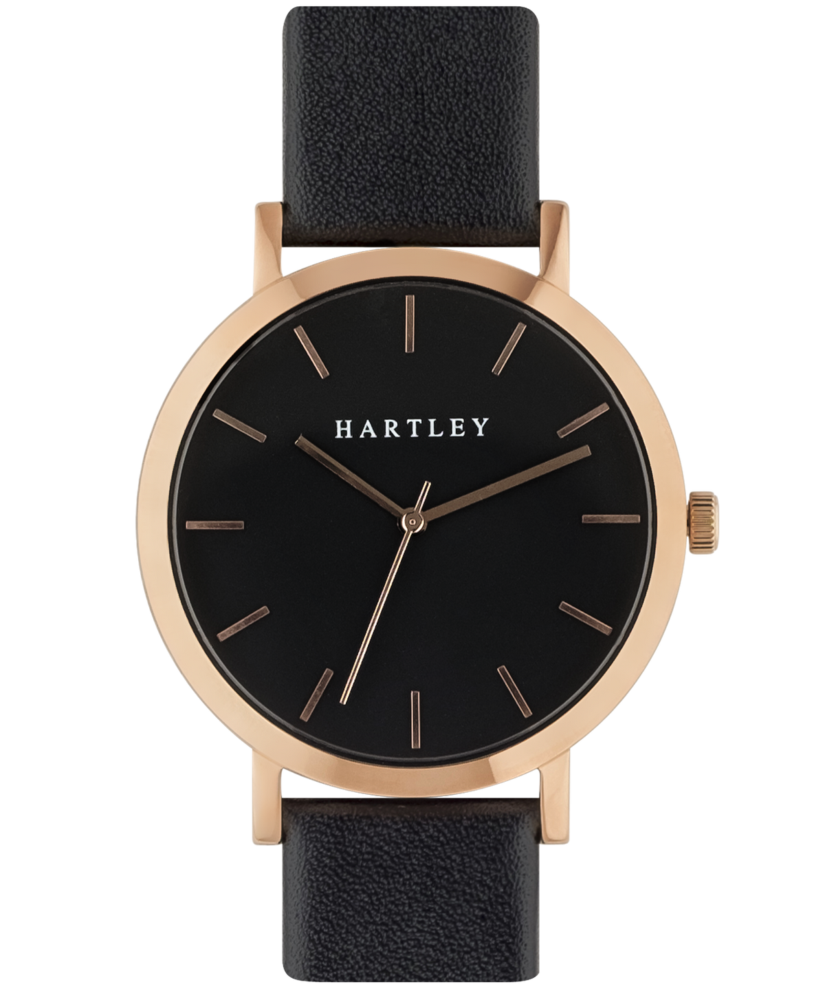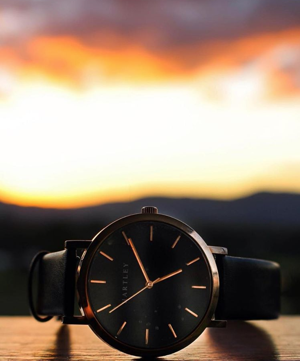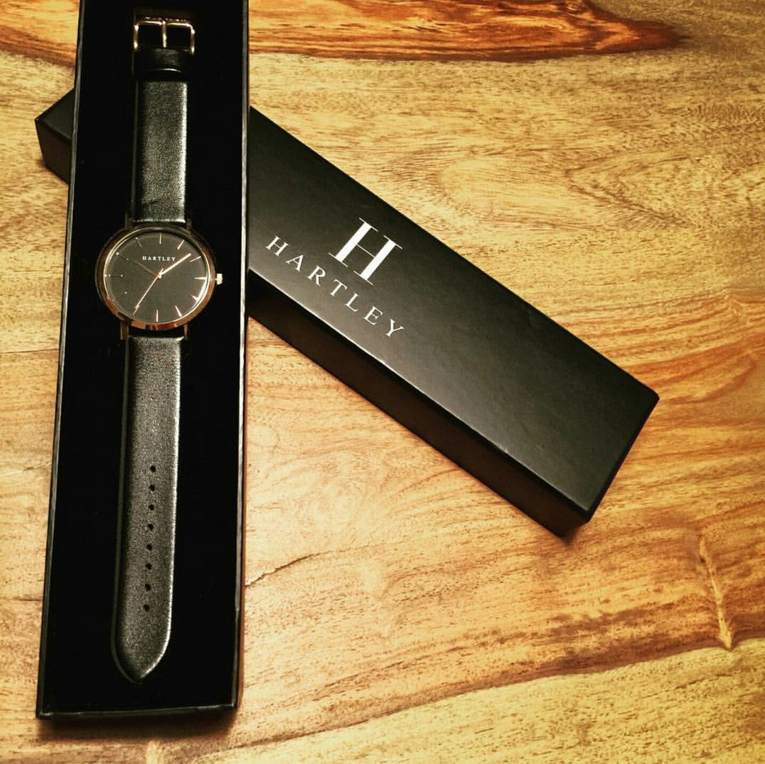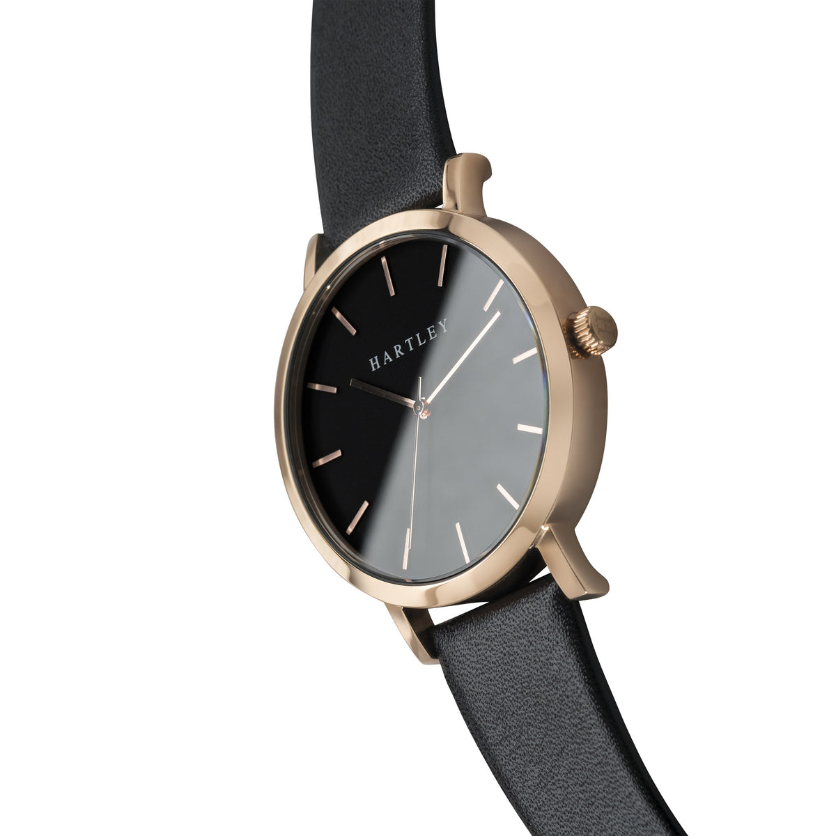 A stunning black & rose gold timepiece featuring polished rose gold dials and hands on a deep black face. Casual or formal, this timepiece suits every occasion.