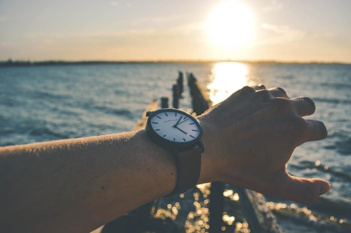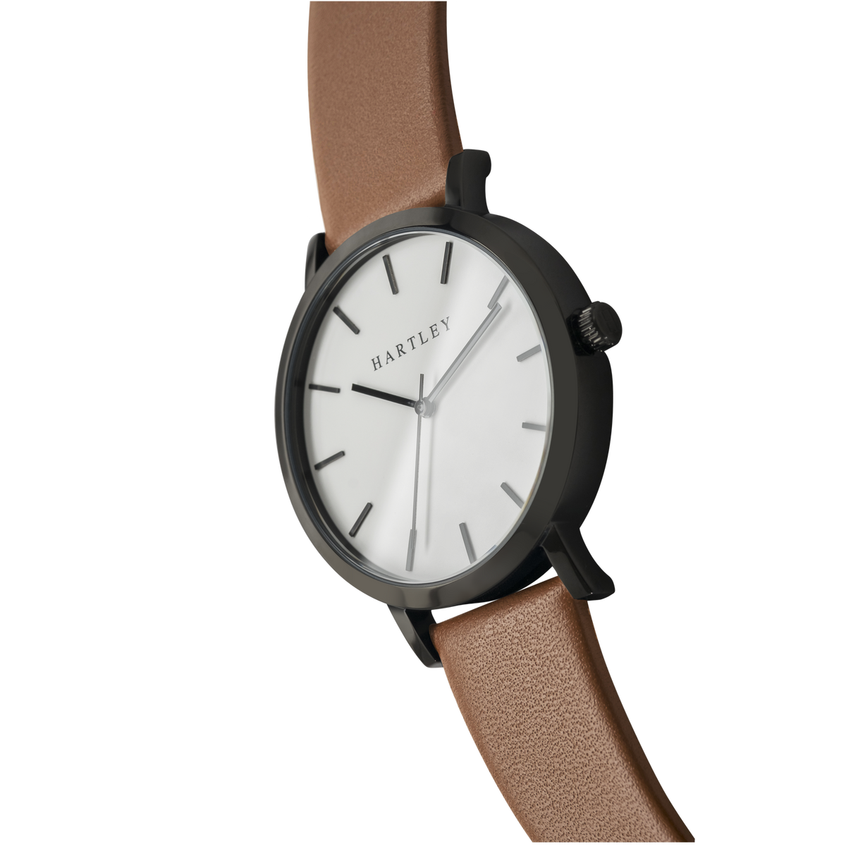 A simple yet sophisticated timepiece featuring a polished black dial on a clean white face with fitting brown bands. Casual or formal, this timepiece suits every occasion.