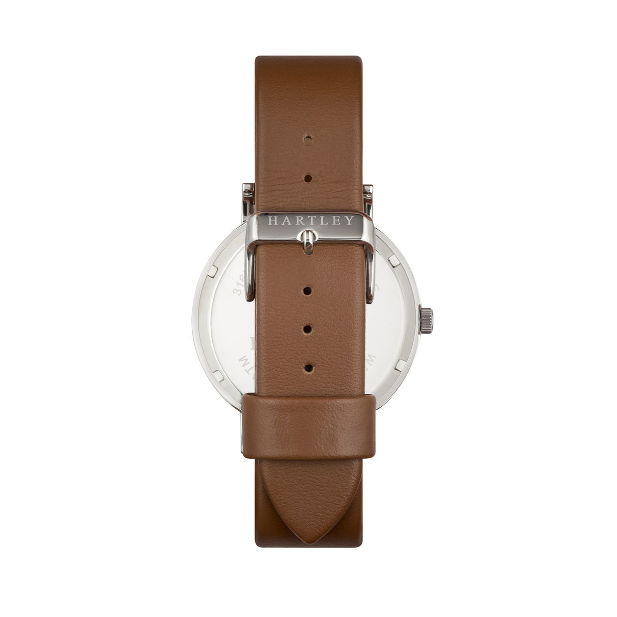 A truly minimalistic brown & silver timepiece featuring polished silver dials and hands on a clean white face. Casual or formal, this timepiece suits every occasion.