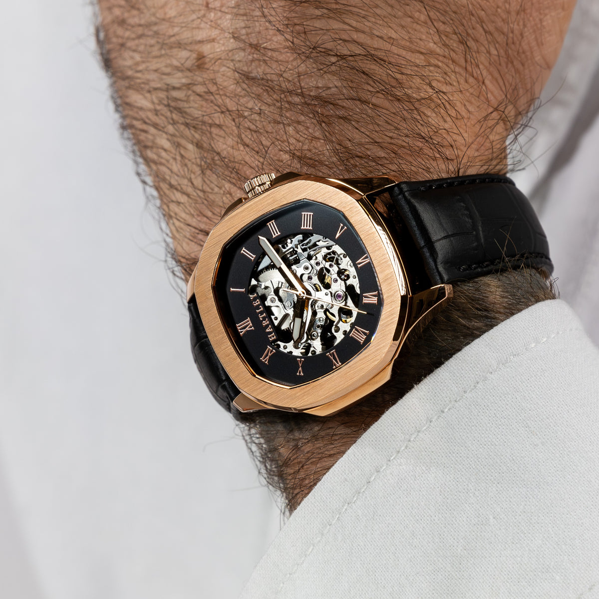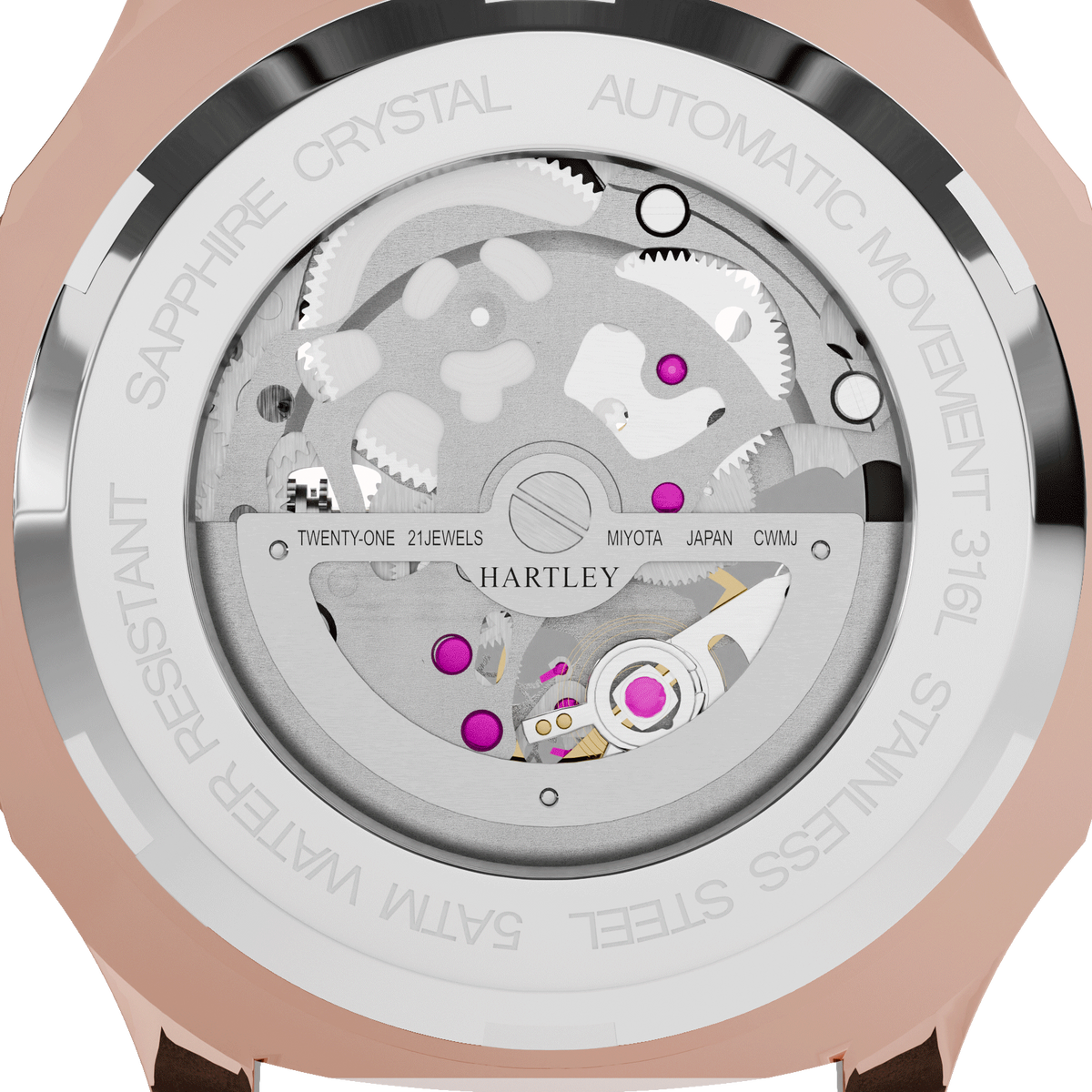 The Hartley Legacy watch boasts the finest glass available—a scratch-resistant sapphire crystal with dual-sided anti-reflective coating for unmatched clarity and durability. This premium sapphire isn’t just on the front; it also graces the back, offering a stunning view of the intricate, skeletonized mechanical movement inside.